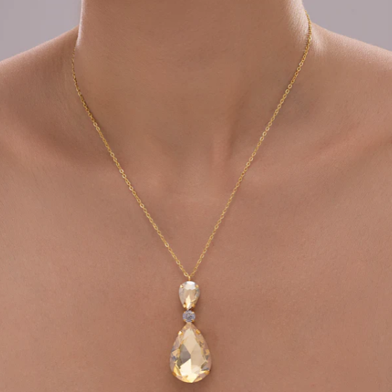 This necklace exudes subtle refinement with its exquisitely faceted drop gems in champagne hues. A delicate shimmer is added by the champagne tone’s soft warmth, giving it a sophisticated and classic charm. Every crystal is positioned with care to capture the light with every motion, giving your neckline a dazzling shine that isn’t overbearing. A sleek, flexible chain hangs the dainty pendant, making it the ideal accessory for a variety of necklines and ensembles. This necklace goes well with both classic and modern styles, whether you’re dressing up for a party or add a little glitz to your regular outfit. It’s the perfect piece to add a little subtle luxury and timeless appeal to your jewelry collection because it’s comfy and lightweight.