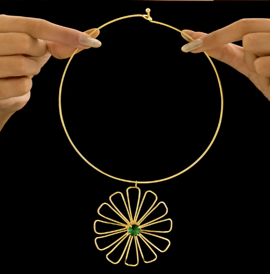 This magnificent wire flower hasli necklace features a gorgeous floral design with meticulous craftsmanship. Each flower is delicately entwined with sparkling crystals, adding a touch of shine and refinement. The lightweight wire construction offers a comfortable fit, and the hasli shape has a modern and elegant silhouette that sits gracefully around the neck. This necklace is ideal for both casual and formal situations, and it effortlessly complements any ensemble. The adjustable length allows for a personalized fit, making it a flexible addition to your jewelry collection. This artwork not only displays your own style, but it also captures the beauty of nature, making it an ideal gift for loved ones or a treasured addition to your personal collection. With this stunning floral necklace, you may embrace both elegance and charm.