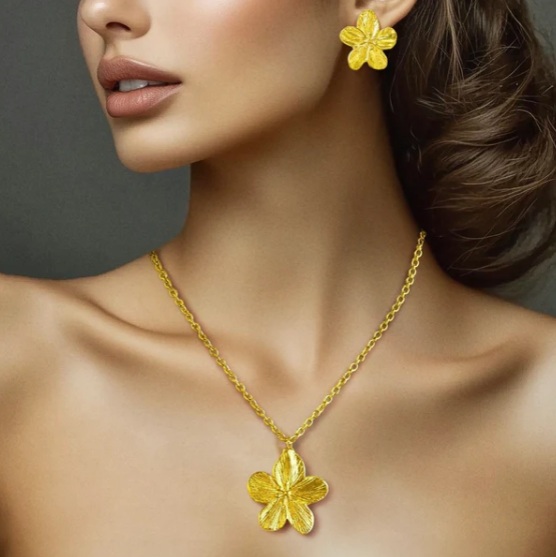 This lovely jewelry set includes a lily blossom pendant necklace and matching earrings, each embellished with dazzling red crystals. The pendant’s exquisite flower design is complemented by the brilliant red crystals, resulting in a stunning contrast that catches light beautifully. The earrings reflect the pendant’s beautiful design, creating a coherent and classy style that goes with any clothing. Whether for a big occasion or everyday elegance, this combination provides a pop of color and charm. Lightweight and comfy, it allows for all-day wear without sacrificing style. Crafted with care, this necklace and earring set has long-lasting beauty, making it an ideal present or classic addition to your jewelry collection, appropriate for any event.