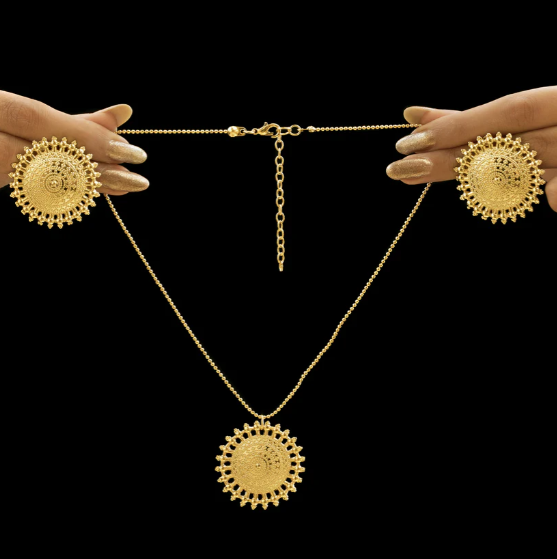 This magnificent ethnic jewelry set has a dazzling sun-inspired design that is intricately designed to create a sense of warmth and energy. The combination comprises a stunningly designed necklace and matching earrings, both embellished with vibrant sun patterns. A sleek ball chain completes the look, giving it a modern twist on the traditional ethnic style. The combination of rich materials and the bright sun emblem makes a bold statement suitable for both casual and celebratory situations. The lightweight and comfortable shape allows for easy wear, while the sun theme’s timeless appeal makes it a flexible addition to any collection. This set is appropriate for those who value a mix of cultural heritage and contemporary style, making it an excellent choice for enhancing any look.