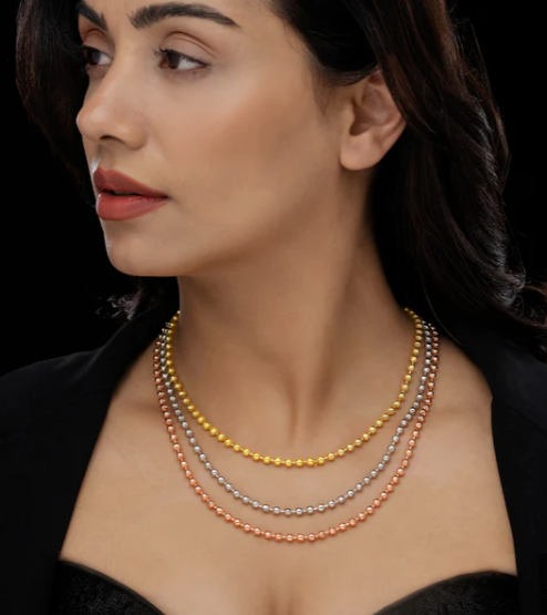 This sophisticated layered necklace, which has delicate ball chains that fall gracefully along the throat, will add flair to your outfit. The multi-layered design creates a sophisticated yet contemporary appearance by adding depth and character. Because each strand is expertly made to provide a smooth flow, the polished beads’ delicate sheen naturally catches the light. Lightweight and adaptable, this necklace goes well with both formal and informal ensembles and is ideal for special events as well as daily wear. This piece has a timeless charm that can be worn alone for a minimalist look or combined with other accessories for a powerful statement. It guarantees a snug fit while retaining an elegant appearance thanks to its comfort and durability-focused design. A must-have piece of jewelry that adds carefree elegance to any ensemble.