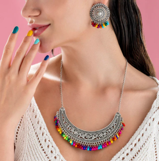 The ghungroo statement necklace is a stunning combination of traditional Indian heritage and modern elegance. It is designed to be the focal point of any outfit expressing majesty and timeless beauty. The necklace usually has a wide complex band that rests beautifully on the collarbone making a bold statement. While based in history the necklace frequently combines modern design features making it suitable for both traditional and contemporary attire. The necklace is studded with several ghungroo bells, which emit a delicate, beautiful melody when moved.