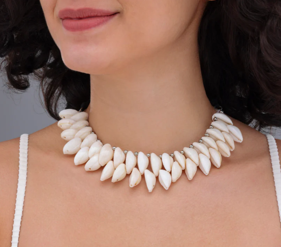 This stunning cowrie shell necklace features a series of beautifully polished ivory shells set on a rhodium-plated chain. The dual-layered design adds depth and dimension, making it a perfect statement piece for any outfit. The short length ensures it sits elegantly around the neck, with the lustrous shells delicately arranged to highlight their unique shape and smooth texture, creating a timeless and sophisticated accessory.