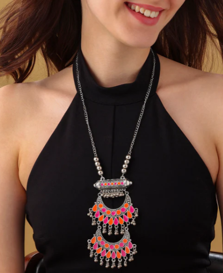 The ghungroo necklace is a stunning combination of classic charm and contemporary elegance. Crafted with precision and embellished with colorful enamel work this necklace pays homage to the captivating charm of ghungroo bells while adding a modern touch. At the heart of the necklace is a series of ghungroo bells, each carefully enameled with intricate patterns and brilliant colours. These little bells reflect the essence of traditional Indian dance echoing the rhythmic melodies and beautiful motions that define this ancient art form.