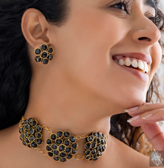 Step into the spotlight with the appeal of our Stunning Black Crystal Beads Choker Necklace & Earring Set. This eye-catching set includes a choker necklace embellished with a waterfall of shiny black crystal beads, expertly arranged to give a dramatic and sophisticated impression. Each bead reflects light with a stunning sheen, lending depth and beauty to the choker’s elegant design. The necklace’s choker shape fits smoothly around the neck, creating a sophisticated and modern silhouette. The matching earrings complement the choker’s dazzling look with black crystal beads that dangle gracefully, capturing the light with each movement. The choker and earrings work together to create a coherent and dramatic impression, making them ideal for making a statement at any event. This outfit is perfect for evening wear or special occasions, combining timeless beauty with a contemporary twist. The black crystals provide a touch of refinement, and the meticulously created design ensures a perfect finish. Elevate your accessory collection with this magnificent set, which combines the attraction of classic glamour with a modern twist